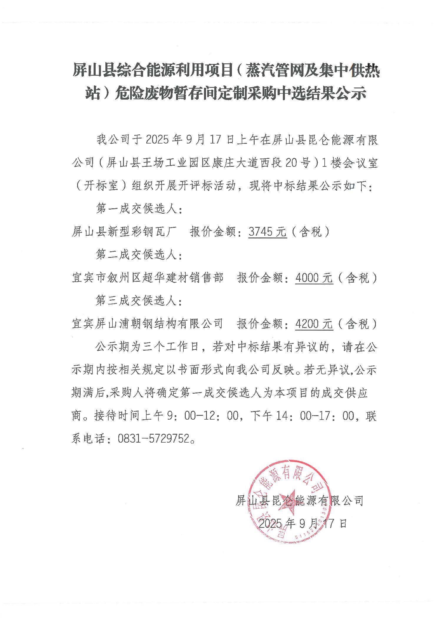 屏山县综合能源利用项目(蒸汽管网及集中供热站)危险废物暂存间定制采购中选结果公示